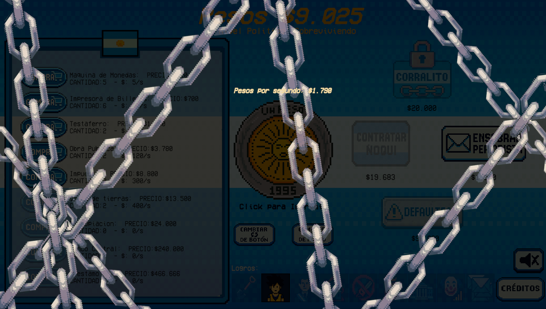 Expandí tu influencia desbloqueando nuevos ministerios, contratando ñoquis, creando impuestos absurdos, y descubriendo políticas económicas dudosas que hacen todo peor… pero tus números se ven bárbaros en los gráficos.